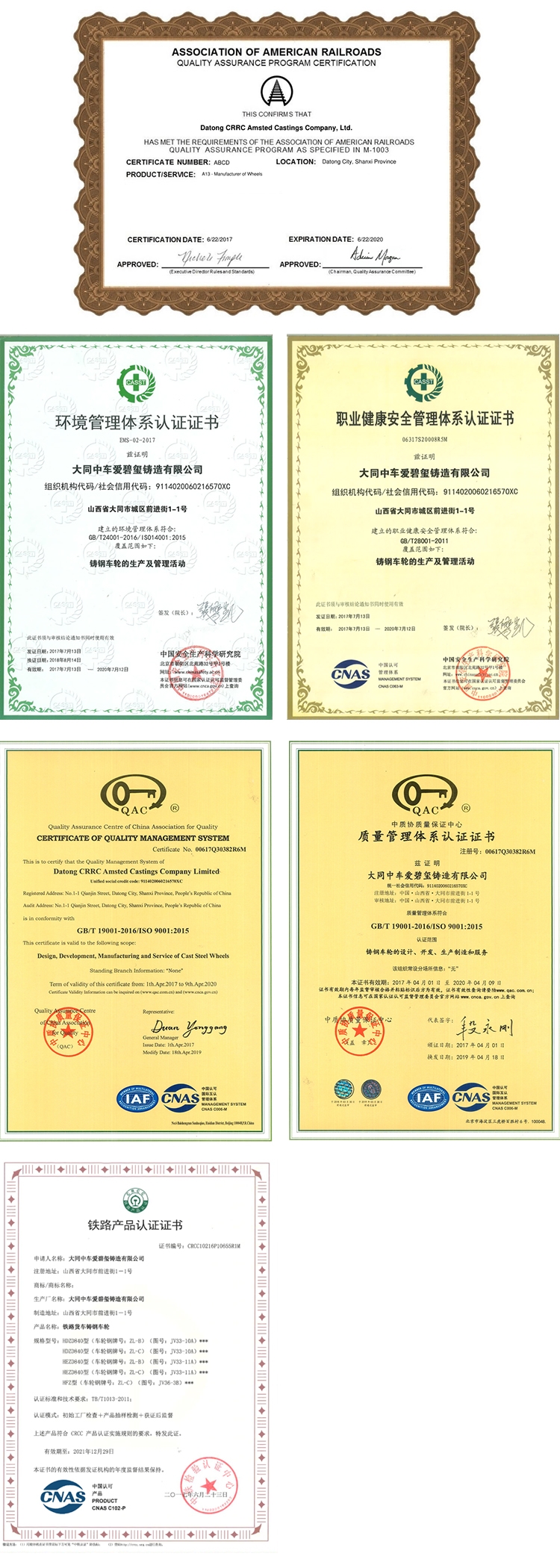 大同中车爱碧玺铸造有限公司不断加强质量和环境管理,先后通过AAR M107/M208,AAR M1003,ISO9001:2008,GB/T24001-2001idtISO14001:2004 和 GB/T28001-2001等认证。