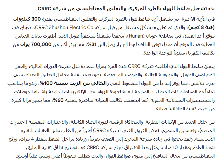 بدء تشغيل ضاغط الهواء بالطرد المركزي والتعليق المغناطيسي من شركة CRRC