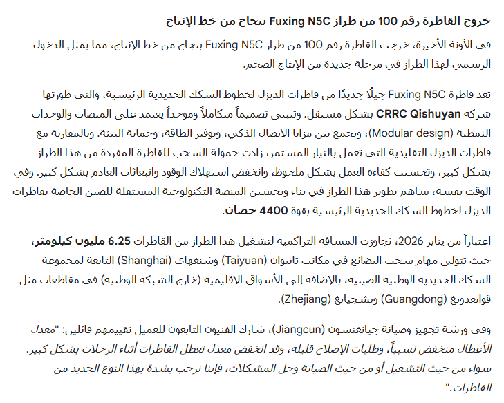 خروج القاطرة رقم 100 من طراز Fuxing N5C بنجاح من خط الإنتاج