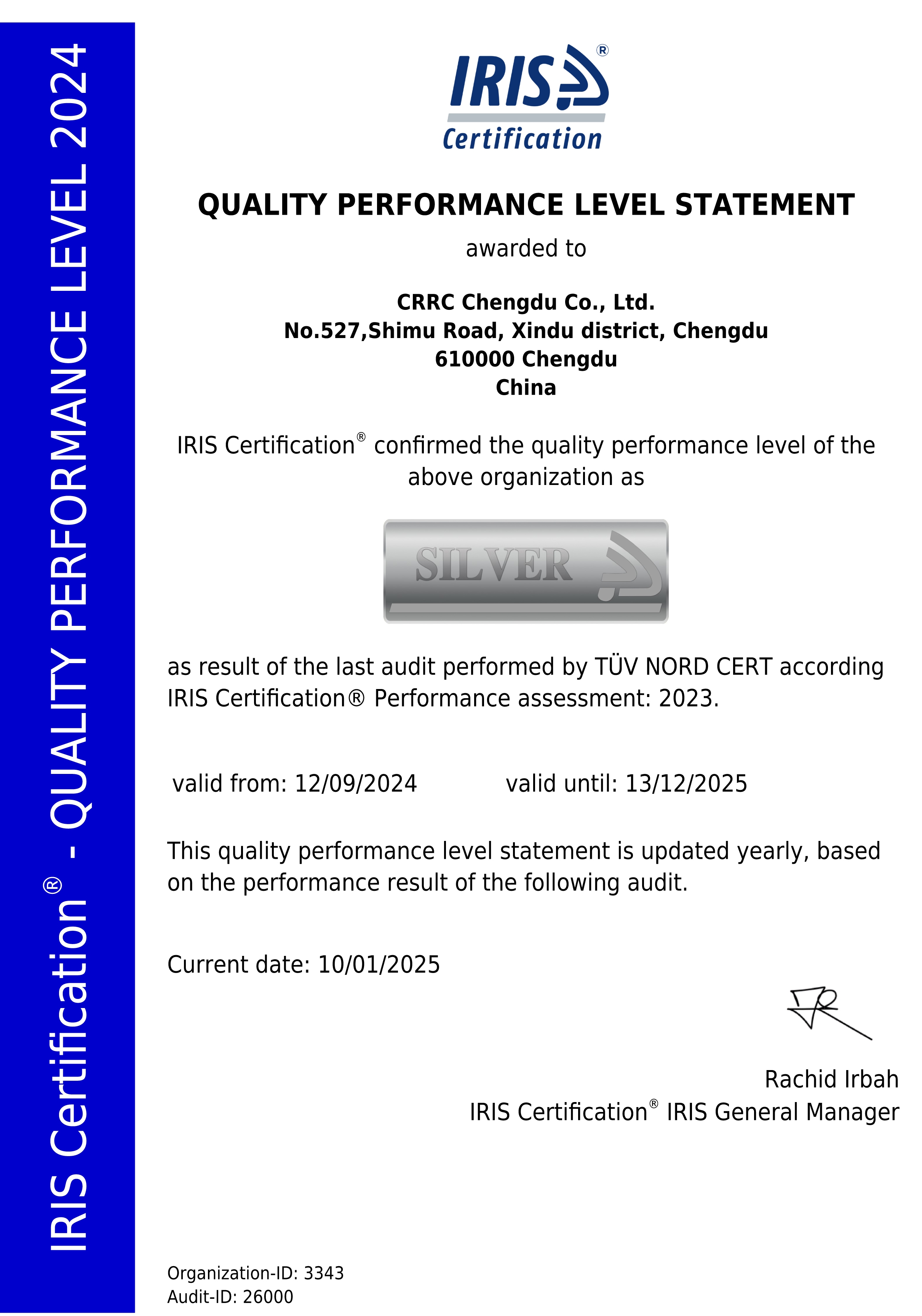 ISOTS 22163质量管理体系“银级”证书