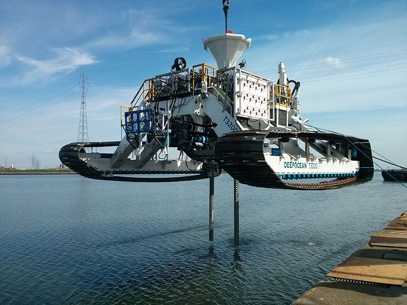 可在水下3000m依靠履带贴地行走。集成大深度海缆高精度电磁探测,依靠自重做底海床,通过链式/轮式切割,满足高海流下的砂土喷射挖沟和岩石机械挖沟,应用于海底光缆、电缆、管道的边敷边埋和后冲埋。
