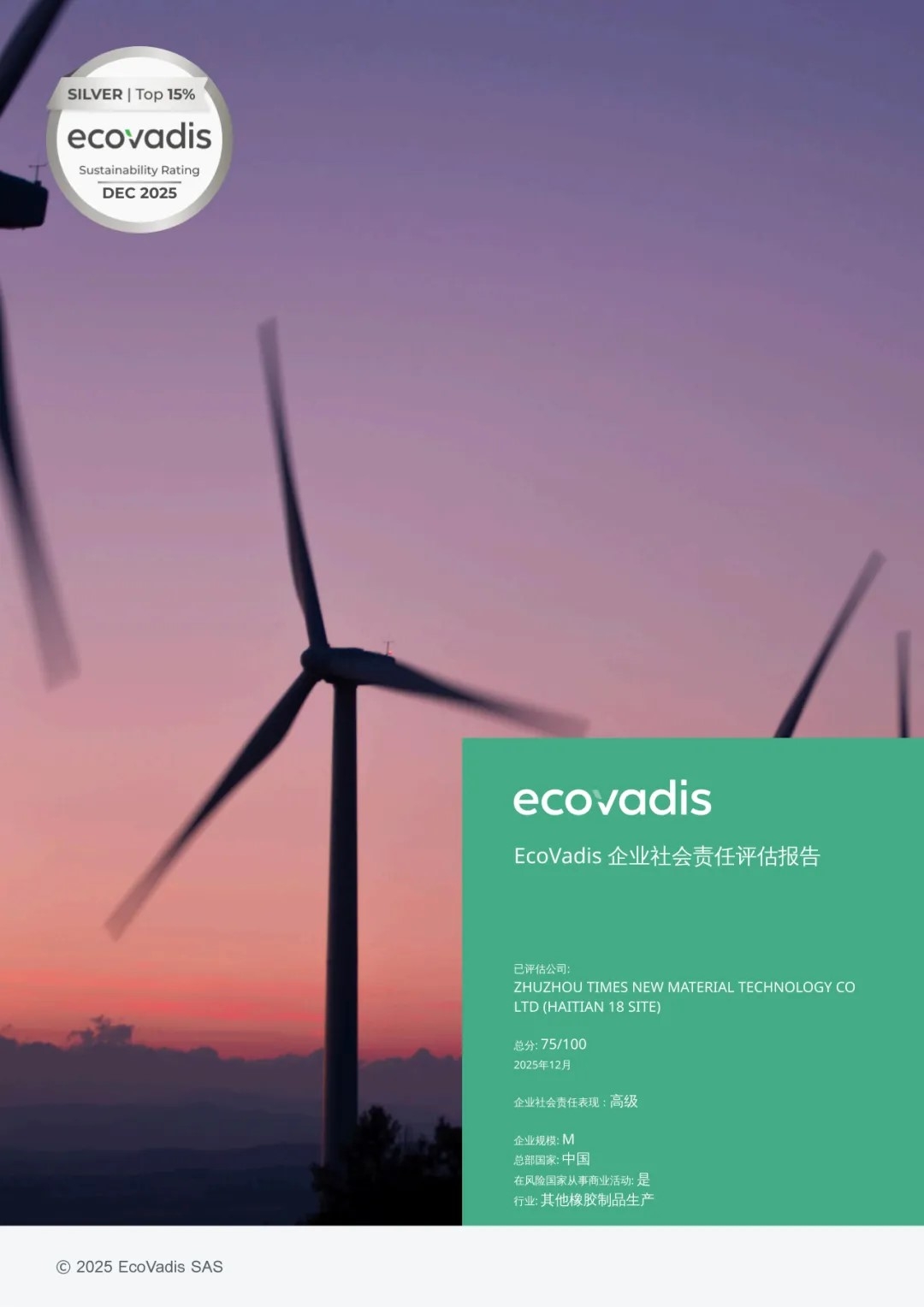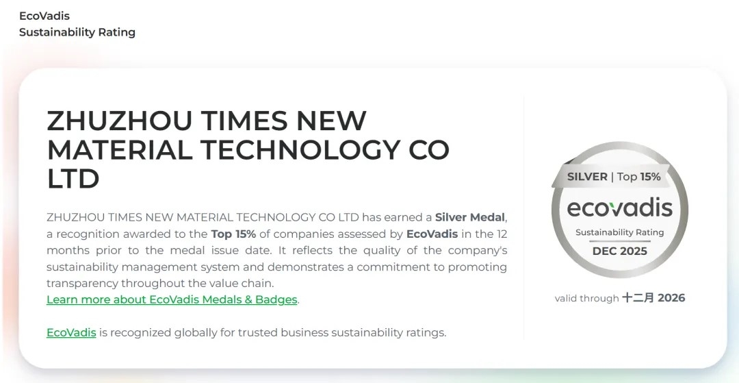 EcoVadis conducts assessments in strict alignment with internationally recognized standards, including the United Nations Global Compact, International Labor Organization conventions, and ISO 26000. Its evaluations cover more than 150,000 companies across 220+ industries in 180+ countries and regions, and have become a key reference for international supply-chain access. The Silver Medal affirms CRRC Times New Material’s long-term integration of sustainability principles into its strategic planning and day-to-day operations, further enhancing its international brand credibility and supply-chain competitiveness.