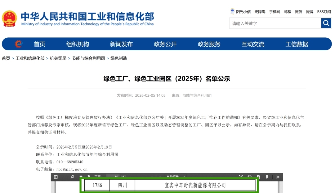 On February 5, Ministry of Industry and Information Technology of the People’s Republic of China (MIIT) released the 2025 list of National Green Factories and Green Industrial Parks. Yibin CRRC Times New Energy Co., Ltd., a subsidiary of CRRC Zhuzhou Institute, was officially recognized as a National-Level Green Factory.