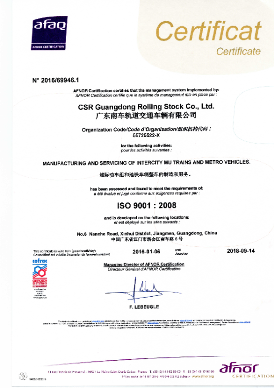 公司致力于开展全员质量管理,于2014年6月3日首次获得ISO9001:2008质量管理体系认证证书,质量管理体系认证范围为城际动车组和地铁车辆整车的制造和服务。