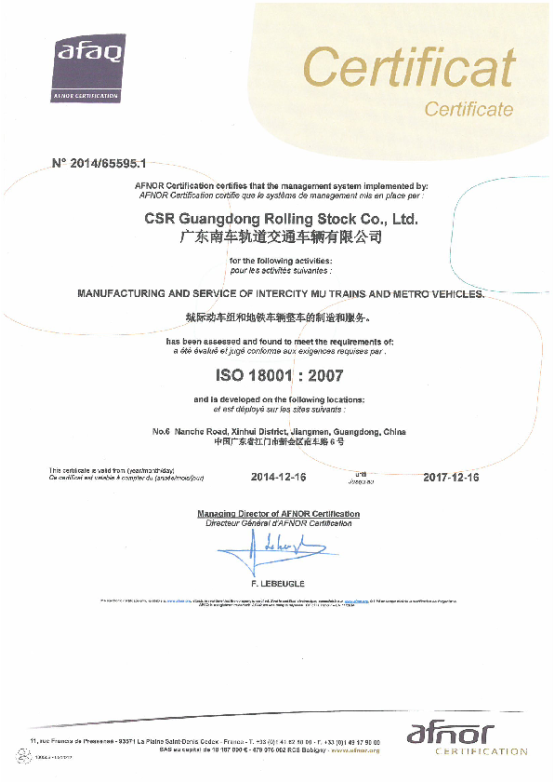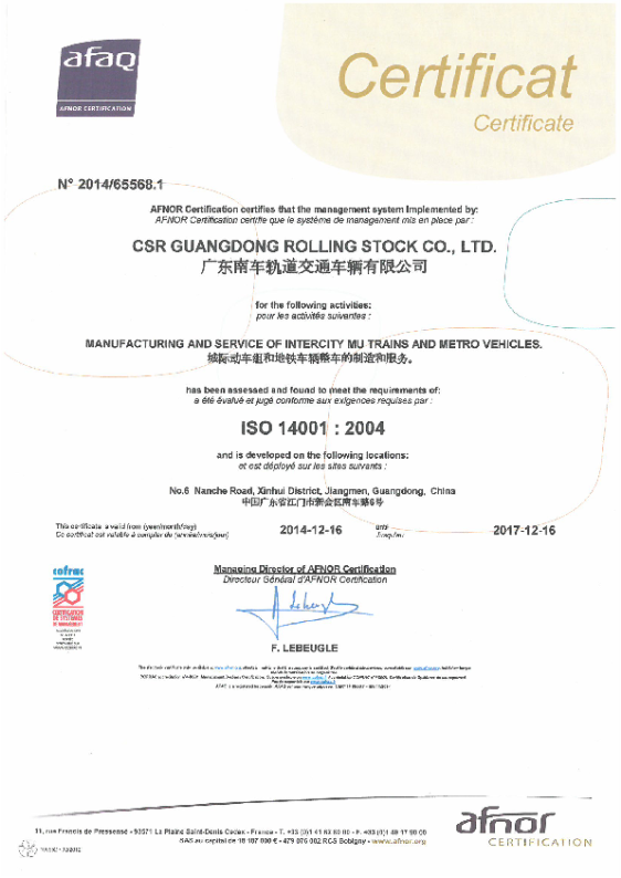公司基于社会责任及对员工健康和安全的需要,致力开展环境保护和职业健康安全管理,建立ISO 14001:2004&OHSAS 18001:2007环境和职业健康安全管理体系, 于2014年12月16日首次获得ISO 14001:2004&OHSAS 18001:2007环境和职业健康安全管理体系认证证书,认证范围为城际动车组和地铁车辆整车的制造和服务。