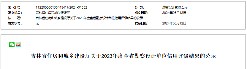近日,2023年度吉林省勘察设计信用等级评级结果在吉林省住房和城乡建设厅网站公示,公司荣获吉林省2023年度全省勘察设计单位信用评级A级的殊荣。