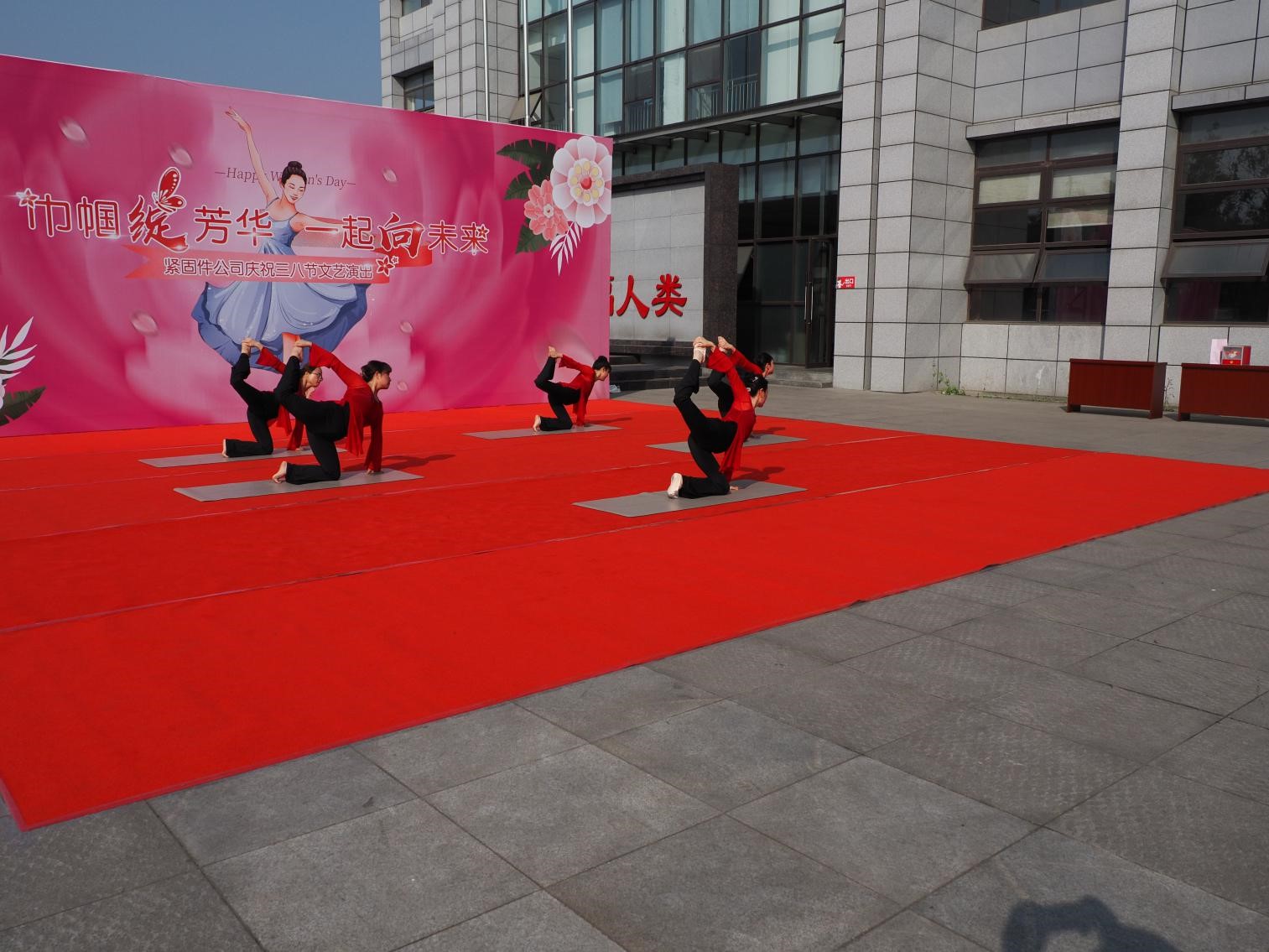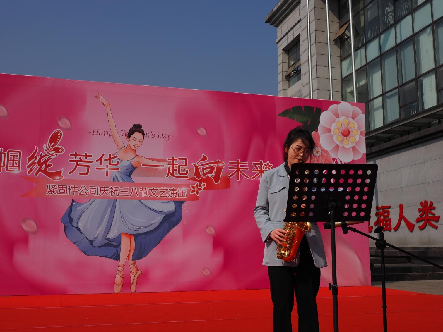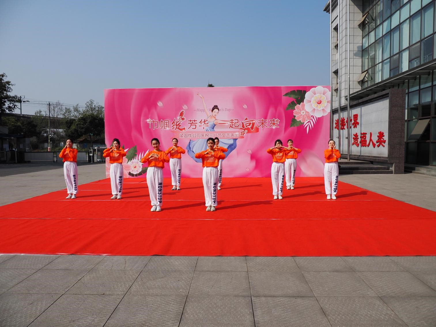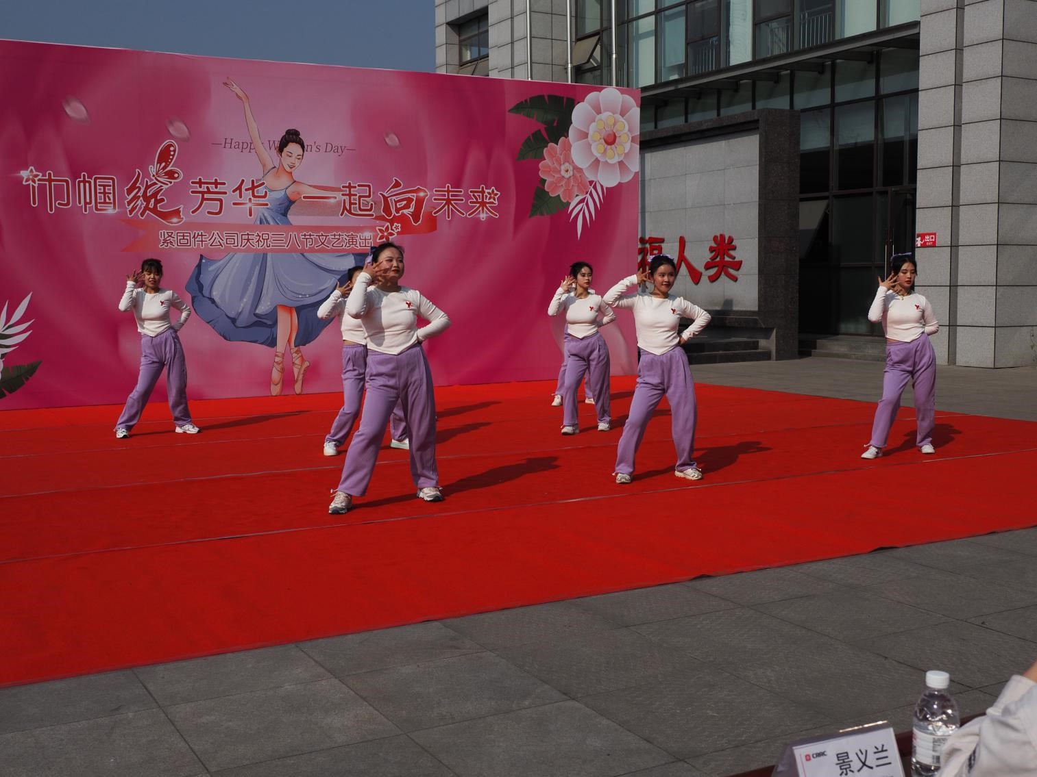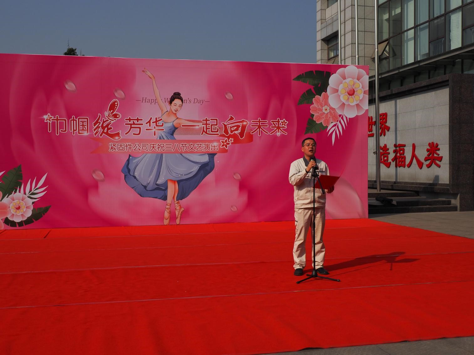 揭牌仪式后,紧固件公司领导班子、中层干部领导、班组长及全体女工分别在紧固件公司小广场主席台就坐欣赏“巾帼绽芳华一起向未来”精彩文艺表演,表演活动由王力主持。