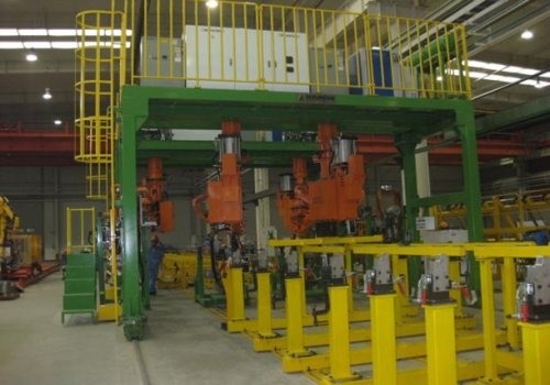 主要作用:采用龙门轨道式运行,自动点焊与手动控制5轴定位相结合的方式进行工作。车间共拥有这样的半自动点焊机器人8台,分别来自韩国现代、韩国丰进、日本电元社和日本NASTOA四个厂家。采用日本三菱以及日本FANCU为控制系统,使用MITACHI、WTCMedWeld4000、AIT-1644-4、BOSCHPSG3200焊接电源及BOS6000等焊接控制系统。