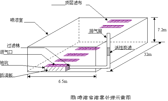 喷烘漆室由室体、空调供风系统、排风及漆雾处理系统、气动三维工作台及电控系统等组成,采用上送下吸、分段送排风的方式。喷漆时,气流在机车周围形成风幕,将悬浮于空气中的漆雾带人室体下部,气流通过室体下部的地坑和折流板,部分漆雾颗粒沉降下来,再经过滤棉过滤,活性炭吸附,最后经排风管排至车间外。工艺图见下图。