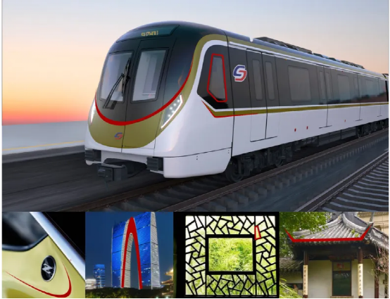 列车采用“橄榄绿”为主色调,车身流线色带恰似水系婉转,彰显着苏州崇文、融和的宏大气度。车头外观设计灵感源于苏州名片“东方之门”,车头造型简约且极具现代感。侧窗设计灵感则源于江南名园沧浪亭“闻妙香室”,网格造型既融入了姑苏古典精巧的历史元素,更体现了苏州厚重的历史感。车灯造型契合了苏州园林四角亭古朴凝炼的独特风格,凸显出城市的底蕴和魅力。
