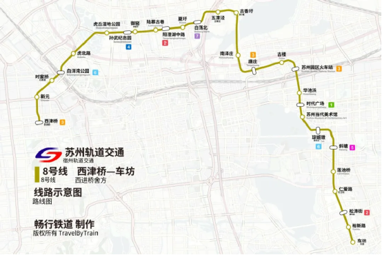 苏州轨道交通8号线全长约35.6公里,设站28座,是古城外围从西北到东南的骨干线路,线路起于苏州高新区的西津桥站,止于苏州工业园区车坊站,呈西北—东南走向。