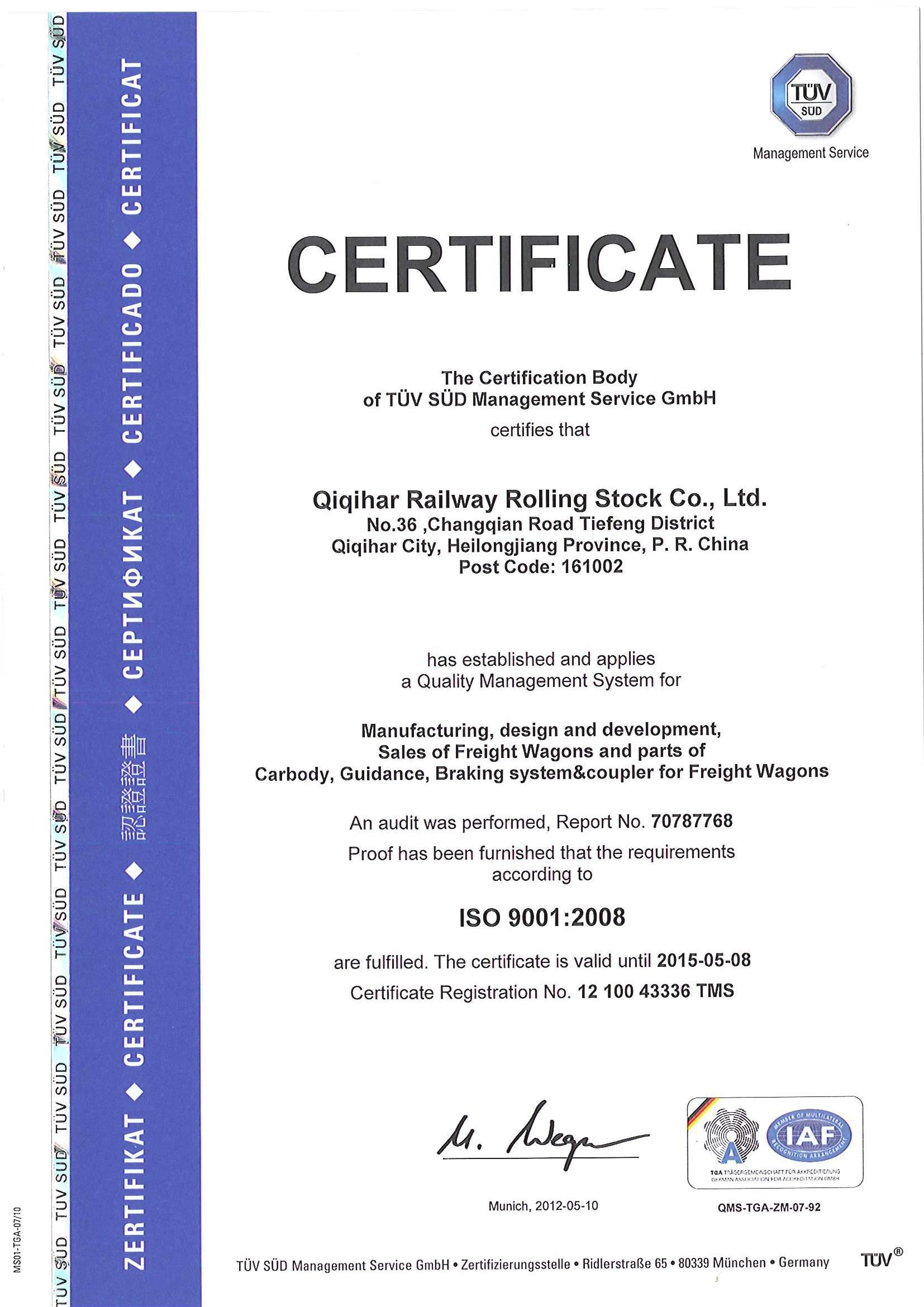 齐轨道装备公司IRIS体系证书