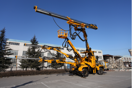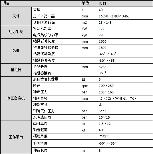 可升降的翼式臂座,在四个多级油缸推动下可实现0°~120°转动,可举升3400mm,整个机构安全平稳,配合钻臂、推进器可实现大断面钻孔;