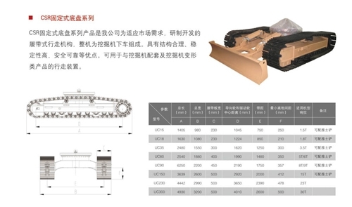 CSR fixed chassis series chassis is a running gear which is independent research and development product to meet the market demand. The equipment is the lower parts of excavator and has advantages of rational structure, high stability, safe and reliable, etc. It could be used as traveling gear for excavator or other similar products.