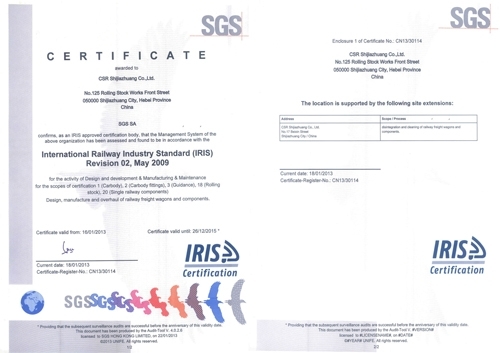 In order to ensure the effective product realization, new technologies, equipments, and management methods have been continuously introduced in for the process research and development, thereby greatly promoting the platform construction of manufacturing technology and laying solid foundation for the optimization of product mix, the promotion of product grade and technological level, and the sustainable development of the company. In terms of construction of product quality assurance system, our company took the lead of being certified by the quality/environment/occupational health and safety integrated management system of GB/T 19001-2000, GB/T 24001-1996 and GB/T 28001-2001 in the industry. Moreover, our company has been certified by the measurement management system of GB/T 19022-2003 and the International Railway Industry Standard (IRIS) in February, 2005 and December, 2012 respectively.