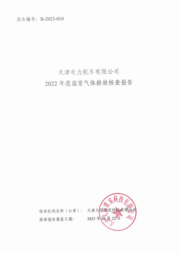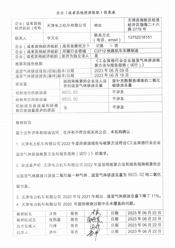 基于文件评审和现场访问,在所有不符合项关闭之后,本机构确认天津电力机车有限公司 2022年度的排放报告与核算方法符合《工业其他行业企业温室气体排放核算方法与报告指南(试行)》的要求。