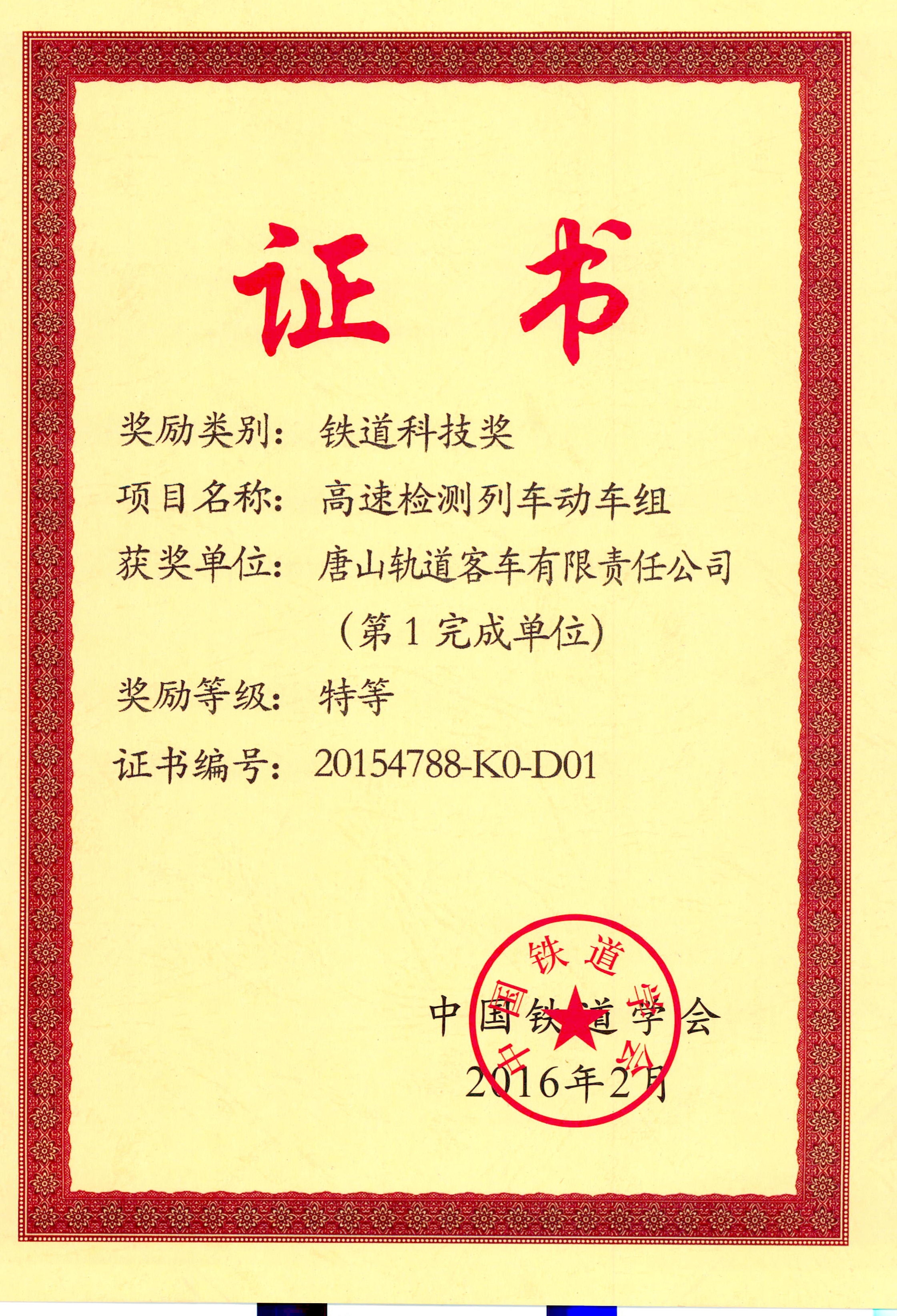 高速检测列车动车组 铁道科技奖 特等