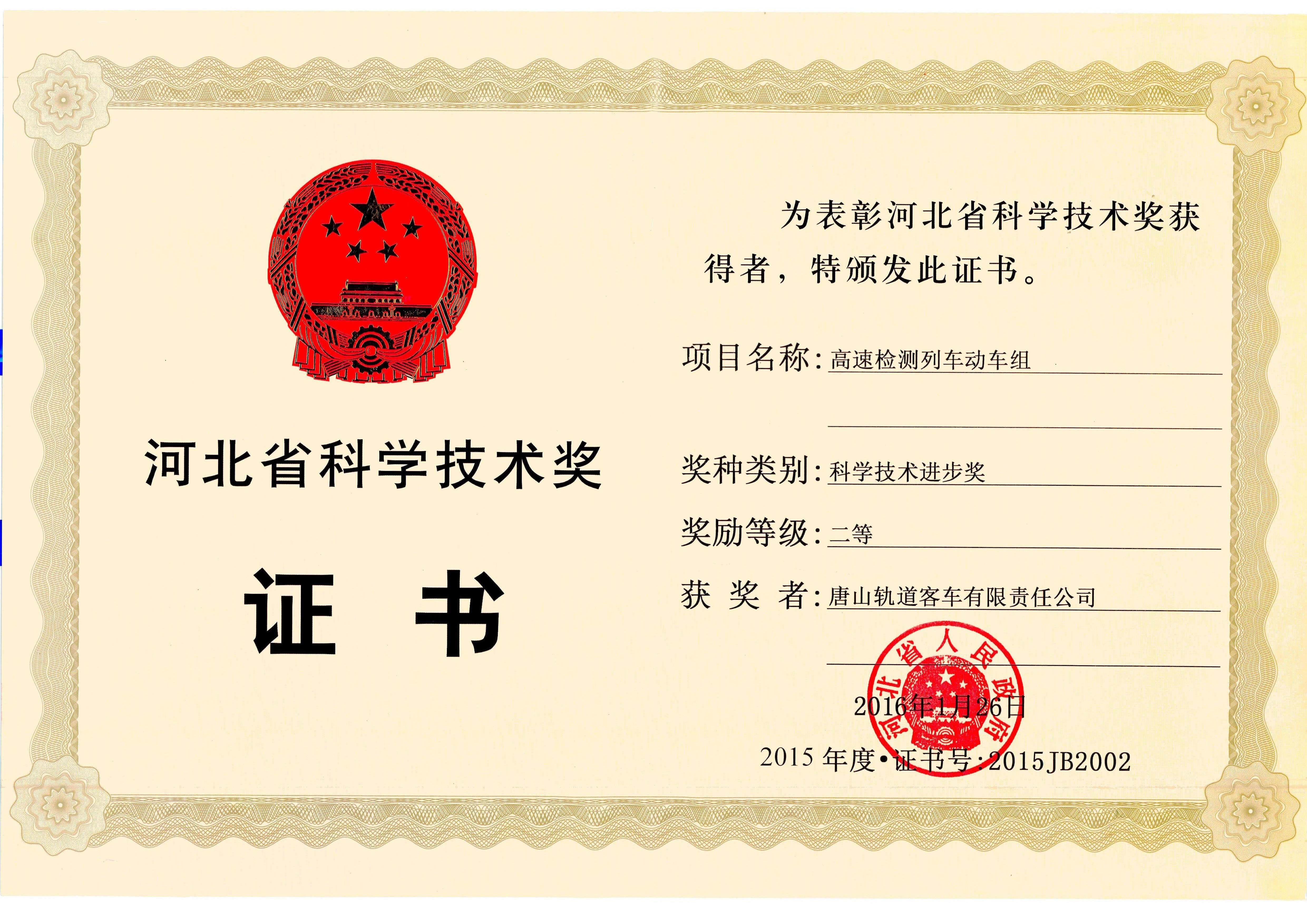高速检测列车动车组 河北省科学技术奖 二等奖