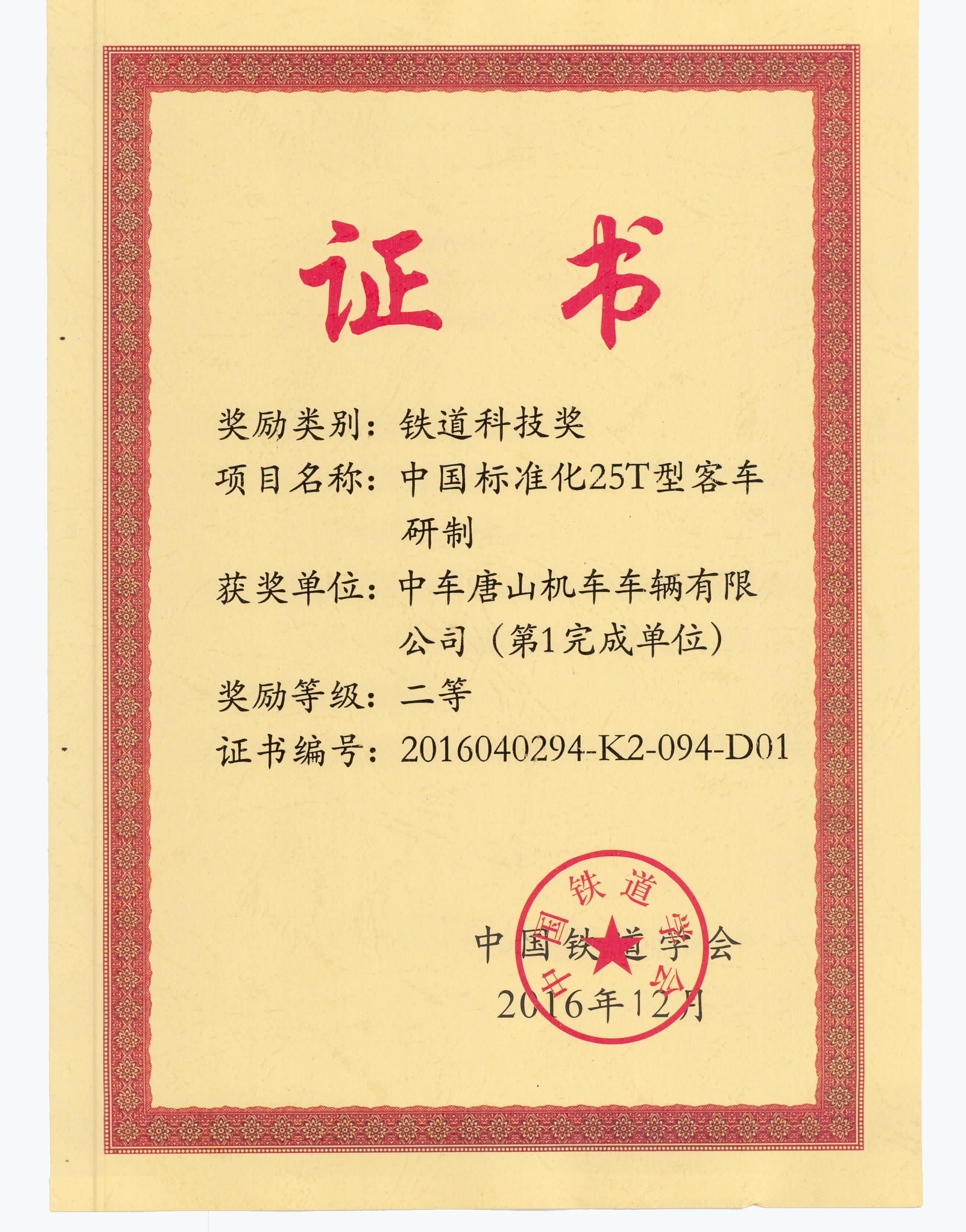 中国标准化25T型客车研制 铁道科技奖 二等