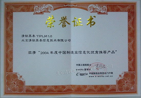 2004年度中国制造业信息化优秀推荐产品(TiPLM)