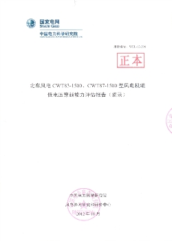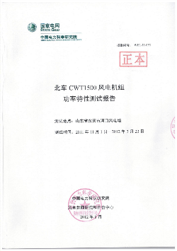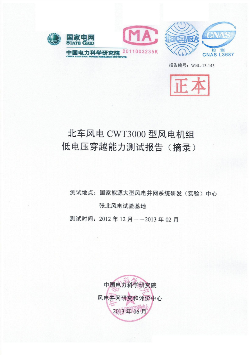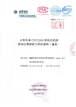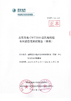 CWT type wind turbines manufactured by CNR have obtained the China Electric Power Research Institute certification, including low voltage ride through capability, power quality, power conditioning, power grids and other functional suitability certification testing, and obtained qualification certificates, met requirements of the grid condition fully.