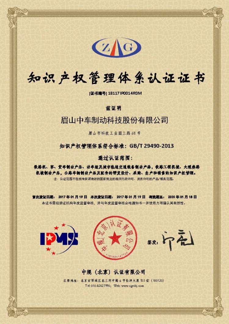 2017年1月22日,公司正式收到中规(北京)认证有限公司颁发的《知识产权管理体系认证证书》,这标志着公司顺利通过《企业知识产权管理规范》(GB/T29490-2013)贯标认证。